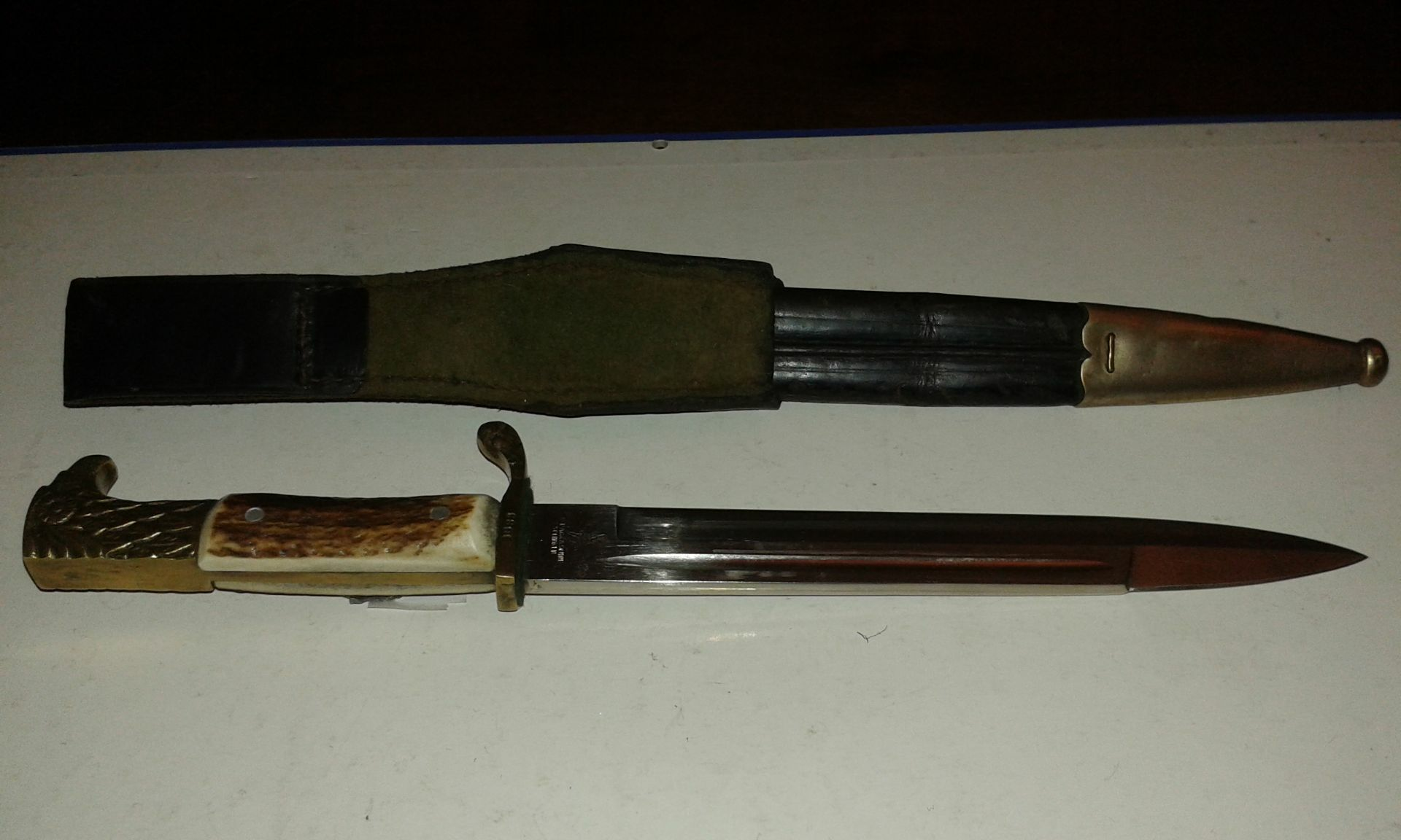 Très belle dague de police Allemande avec manche bois de cerf d'époque, longueur totale 31 cm, longueur de la lame 20 cm avec très belles décorations et marquages d'époque. Le fourreau est en cuir très bien conservé, le porte étui est d'époque également très bien conservé, la dague est numérotée.