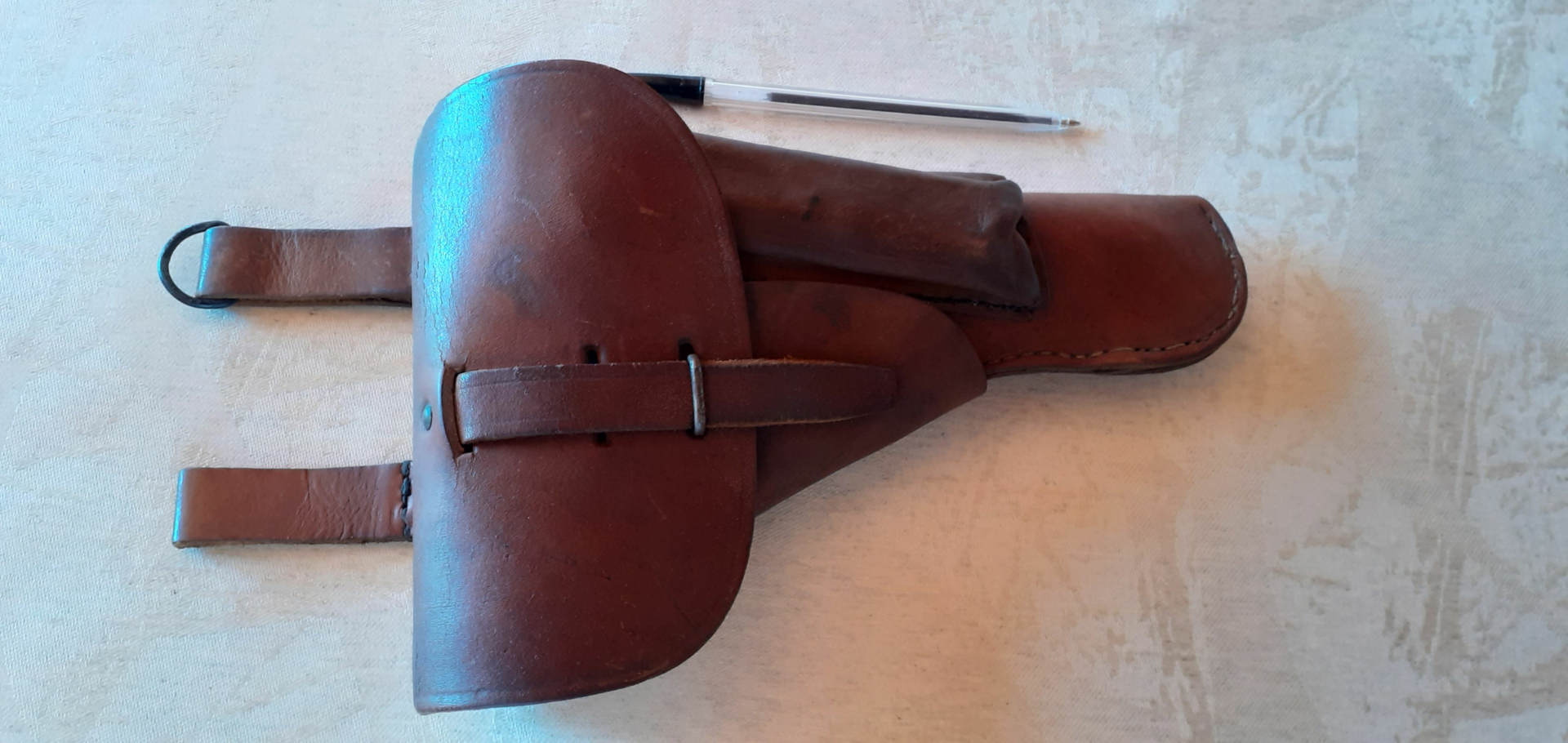 Avec son étui P38 Indochine (réf. 166) en cuir fauve rigide ainsi que la réservation pour un chargeur.