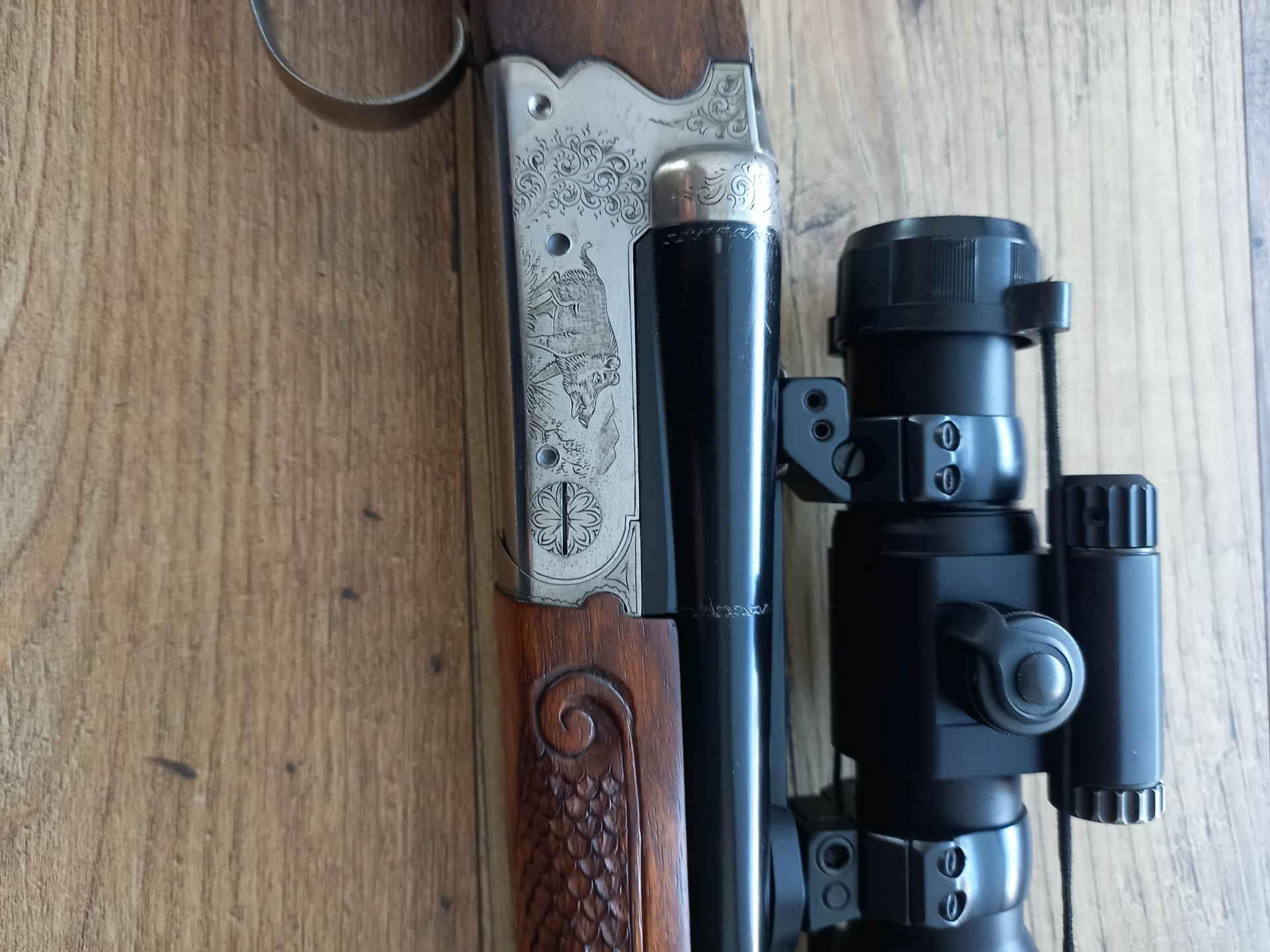 vends express juxtapose demas eloge (EXTRA LUXE) en 9.3 /74 canon de 60 cm poids 3KG500 equipe d un aimpoint 9000 4 moa avec son montage d origine eaw.tres beau noyer francais; squelette de crosse; ecaille de poisson sur crosse et longuesse; goutte d eau ;bascule entaillee et gravee ripamonti mof de france; pontet long; pieces metalliques finemement ciselees sur longuesse et crosse; crosse anglaise; convergeance de 2,5 cm a 75 M avec18,,5 GRS OU 16,5 grs la convergeance ne bouge pas.photos sur demande ou visible sur naturabuy.express en tres tres bon etat.