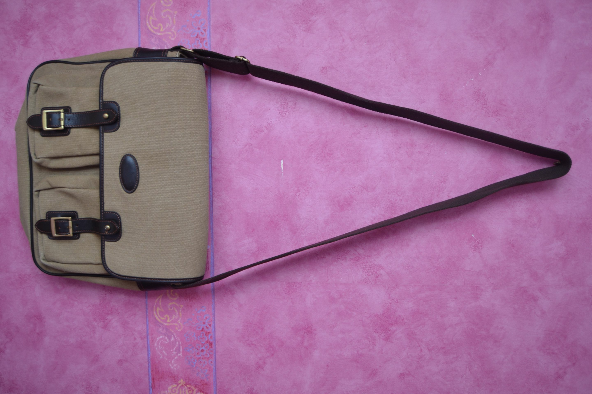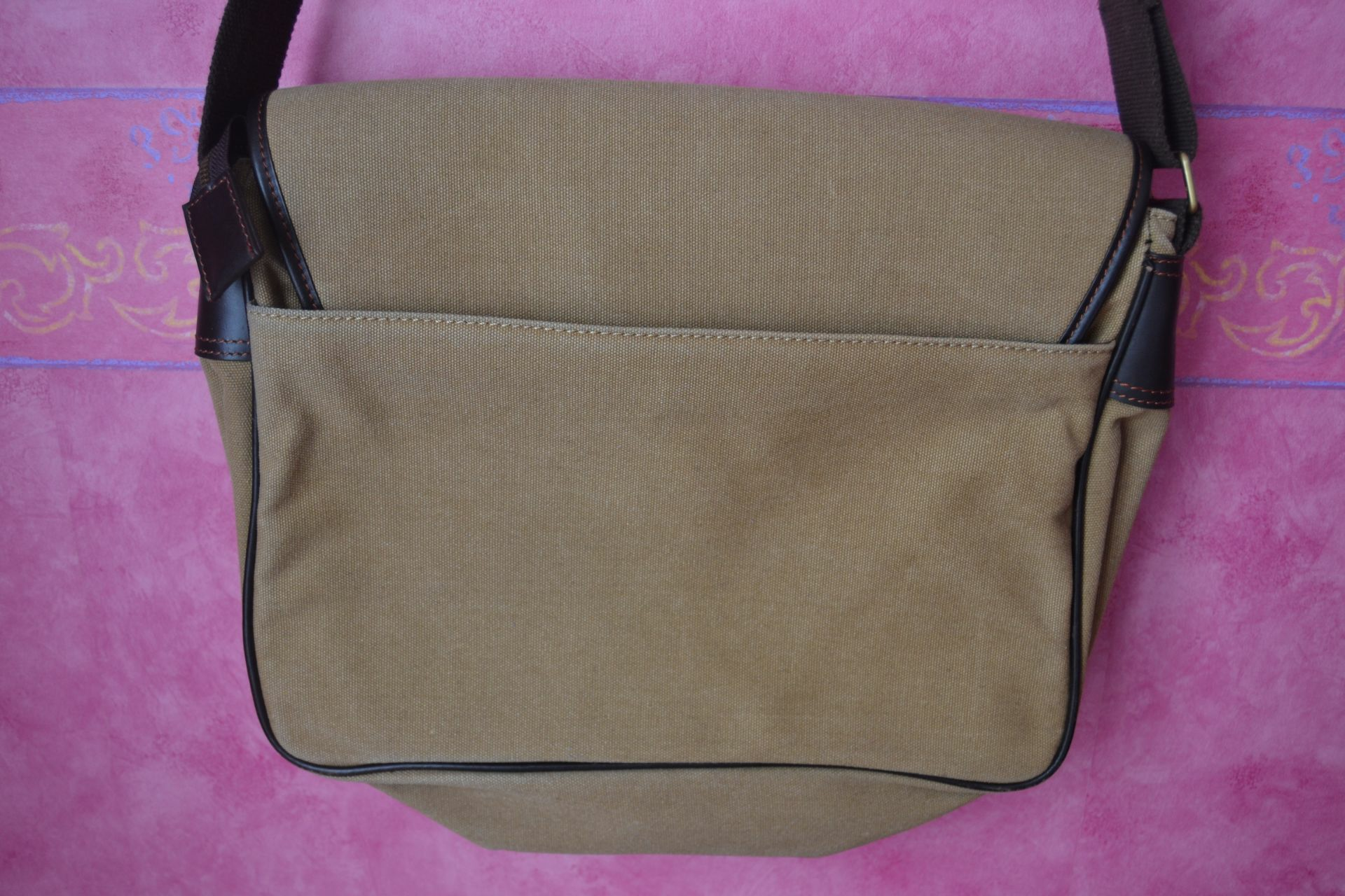 1 compartiment centrale, 2 poches à souflets devant avec fermeture lannières cuir et 1 poche arrière.